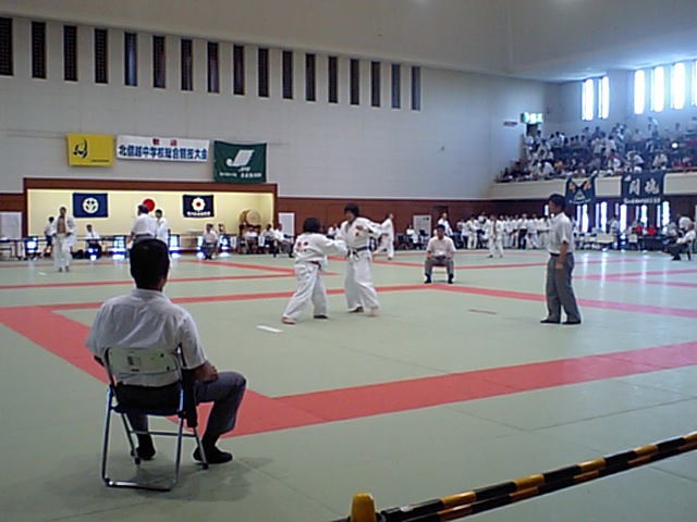 県立武道館で、北信越大会の柔道競技が行われています。 越前中1年のSさんが個人戦に出場しています。さすがに北信越各県の代表の集まりだけあり、ハイレベルの戦いが続いています。また、とても沢山の選手と応援の人が来ているので、武道館周辺の農道まで車で一杯です。Sさんは、石川県の1位という、超強豪の3年生との戦いでした。よく攻めて奮闘しましたが、押さえ込まれてしまいました。