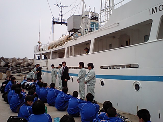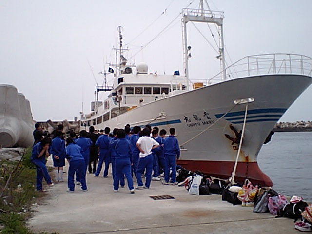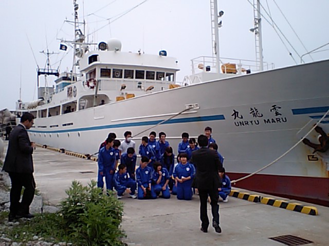 大樟漁港に来ている小浜水産高校の実習船、雲龍丸に体験乗船しています。説明などを聞いた後、体験航海も行います。一般の方も一緒に体験乗船しています。